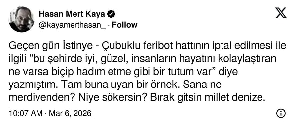 İstanbul Bebek sahilinde yıllardır denize girmek için kullanılan bir merdivenin belediye ekipleri tarafından kaldırıldığı iddiası gündem oldu. İçerik üreticisi Aydın Aydıner, sosyal medya hesabından yaptığı paylaşımda söz konusu merdivenin kesilerek kaldırıldığını öne sürdü. Aydıner, uygulamanın vatandaşların denize girmesini engellemeye yönelik olduğunu savundu. Sosyal medya kullanıcılarından yorumlar gecikmedi.