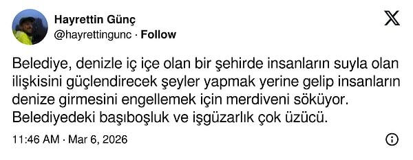 İçerik üreticisi Aydın Aydıner, Bebek’te yıllardır denize girmek için kullandıkları merdivenin belediye ekipleri tarafından kesilerek kaldırıldığını söyledi.