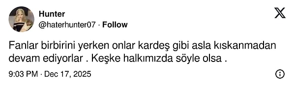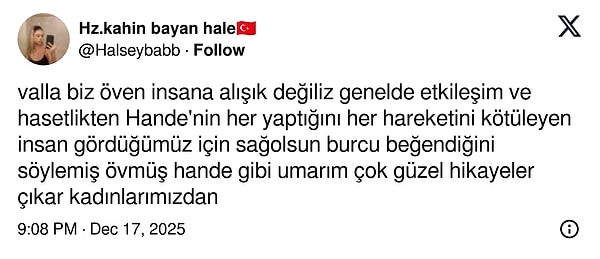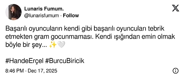 Burcu Biricik’in bu samimi sözleri kısa sürede sosyal medyada gündem olurken, kullanıcılar da iki oyuncu arasındaki desteği alkışladı.