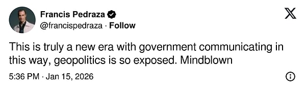 'Hükümetin bu şekilde iletişim kurmasıyla gerçekten yeni bir çağ başladı, jeopolitik durum çok daha açık bir şekilde ortaya çıkıyor. Hayretler içindeyim!'