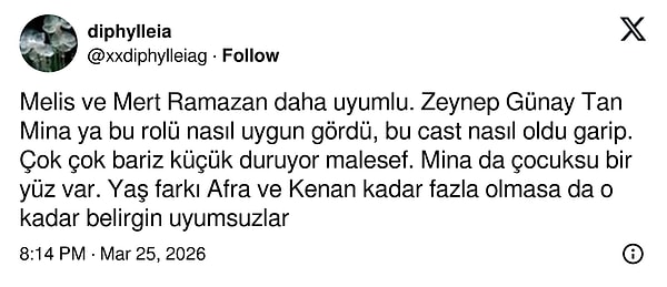 Sezona başlayacak dizinin henüz yayın günü ve tarihi belli değil. Ancak yayınlanan fragman sonrası son zamanların en tartışmalı konusu yeniden gündem oldu. 18 yaşındaki Mina Demirtaş ile 28 yaşındaki Mert Ramazan Demir'in yaş farkı tartışma konusu oldu.