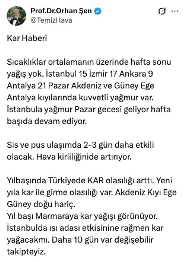 Meteoroloji Uzmanı Orhan Şen sosyal medya hesabından yaptığı açıklamada şu ifadeleri kullandı: