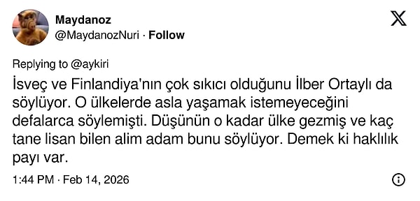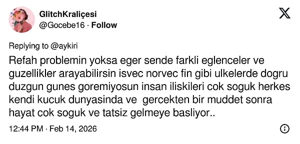 İsveç'te doğup büyüyen bir kadın kendisine 'Çok şanslısın' diyenlere İsveç'teki yaşam koşullarını anlattı. Genç kadına kimileri hak verirken kimileri ise dertlerini sıradan buldu.