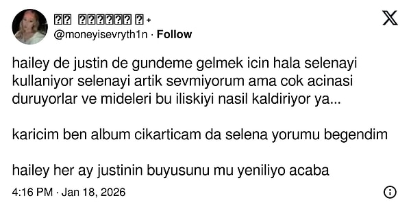 Son aylarda Bieber’ın, Selena ve Benny Blanco ile ilgili yaptığı “yanlışlıkla mı, bilerek mi?” denilen hamleler dikkat çekmişti. Önce Benny Blanco’yu takipten çıkmış, sonra Selena’yla ilgili bir hayran sayfasının paylaşımını beğenip geri çekmişti.