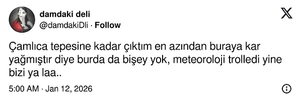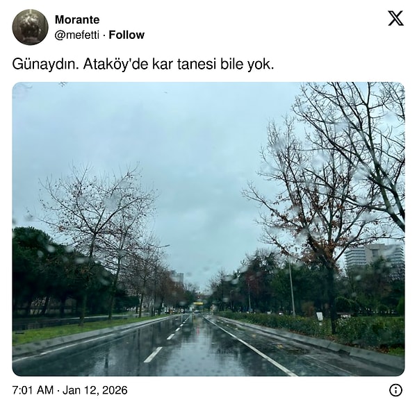 Yurdun büyük bölümü 2026'ya kar haberleriyle girse de medyada en çok merak edilen 16 milyonluk nüfusuyla İstanbul oldu. 'İstanbul'a kar yağacak mı?' soruları gündemi uzun süre meşgul etti. Meteoroloji ve pek çok uzman geçtiğimiz haftadan beri 12 Ocak Pazartesi işaret ediliyordu. Hatta pazar günü okulların tatil edildiği açıklandı. Ancak oluşan görüntü pek çok kişide hayal kırıklığı yaşattı. Bunlardan biri de deneyimli gazeteci Uğur Dündar oldu.