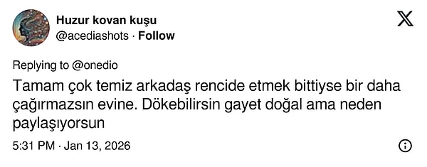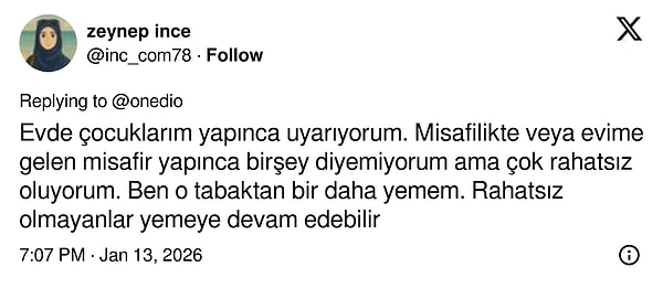 Pek çok kişi kadının bu hareketini doğru bulduğunu, aynı durumda kendisi de olsa aynı şeyi yapacağını belirtti. Kimileri ise bu hareketin son derece gereksiz olduğunu, tiksineceğiniz insanları evinize çağırmamanız gerektiğini savundu. Bazıları ise yaptığı şey yanlış olmasa bile, bunu sosyal medyada paylaşmanın misafire yapılan bir ayıp olduğunu dile getirdi.