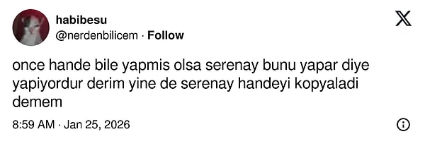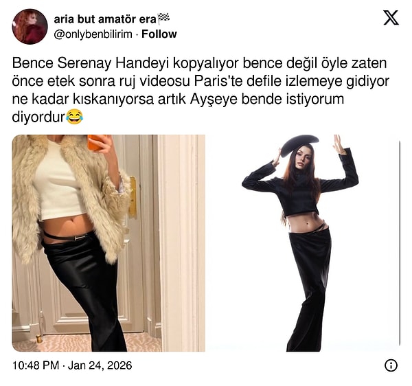 Serenay Sarıkaya'nın peş peşe yaptığı son paylaşımların Hande Erçel'le aynı oluşu X'i karıştırdı. Bir de üstüne aynı kombin eklenince 'Kopyalama' iddiası timeline'ı fena alevlendirdi.