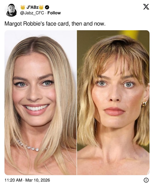 Ortaya çıkan görüntülerinde yüz hatlarının daha belirgin görünmesi sosyal medyada dikkat çekince, Robbie hakkında “yanak yağlarını aldırdı mı?” soruları gündeme geldi. Ünlü oyuncunun son hali kısa sürede sosyal medyada yayılırken, kullanıcılar Robbie’nin yüzündeki değişim üzerine yorum yağdırdı.