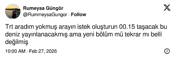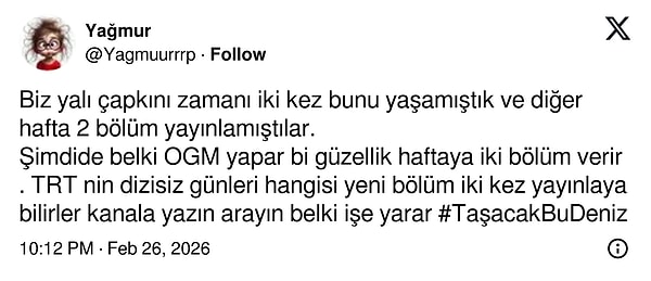 Taşacak Bu Deniz'in 27 Şubat Cuma akşamı yayınlanacak bölümü son anda iptal edildi. Haberi duyan izleyiciler 'Taşacak Bu Deniz neden yok, neden iptal edildi?', 'Taşacak Bu Deniz yeni bölüm ne zaman?' diye sormaya ve duruma isyan etmeye başladılar. Karardan hiç memnun kalmayan izleyiciler çareyi TRT'yi aramakta buldu.